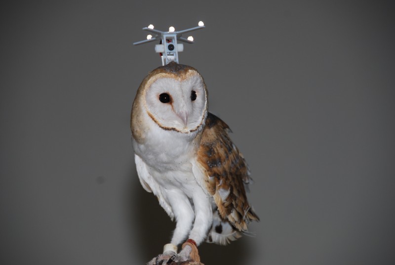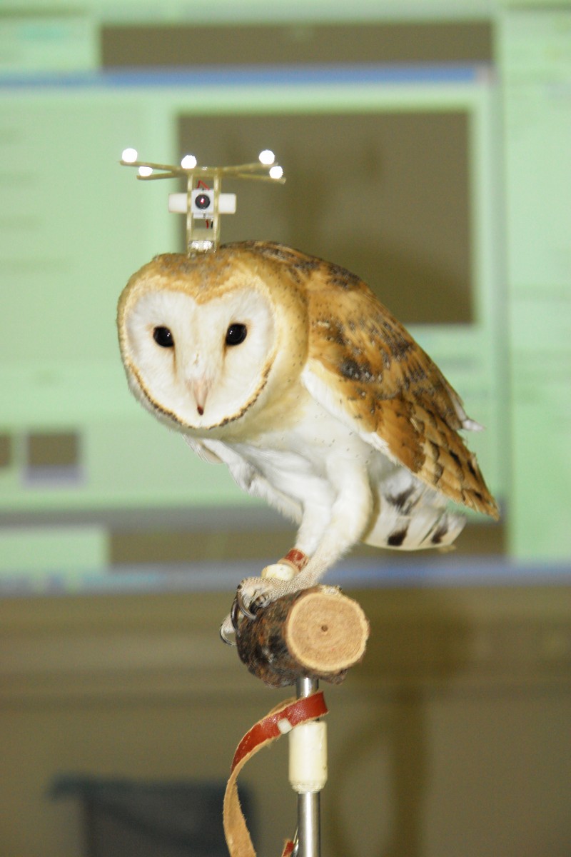 Another particularity of barn owls is the asymmetric position of ears on either side of their head. The capability of barn owls to track preys by auditory signals only has been observed, and it may also play an important role in distance estimation.