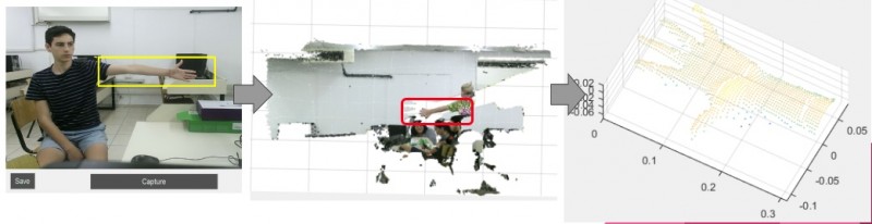 Our low-cost prosthetics are made using 3D printing technology in order to custom fit a mechanical hand and its cosmetic design to the user. Custom fitting of the prosthetic hand is very important in order to prevent pressure wounds, phantom pains and constant discomfort. Therefore, our hand designs are parametric and can be deformed and adjusted per user. To do that we also developed a scanning tool in-which the user’s hand is scanned and 3D modeled using low cost 3D cameras (such as Microsoft Kinect). The collected scans are then introduced to an algorithm we developed (Figure 1 and 2). The results of this algorithm is a user friendly 3D reconstruction of the user limb (Figure 2). The geometric data extracted from this model are then used to modify the specific hand design to a specific user anatomy.
